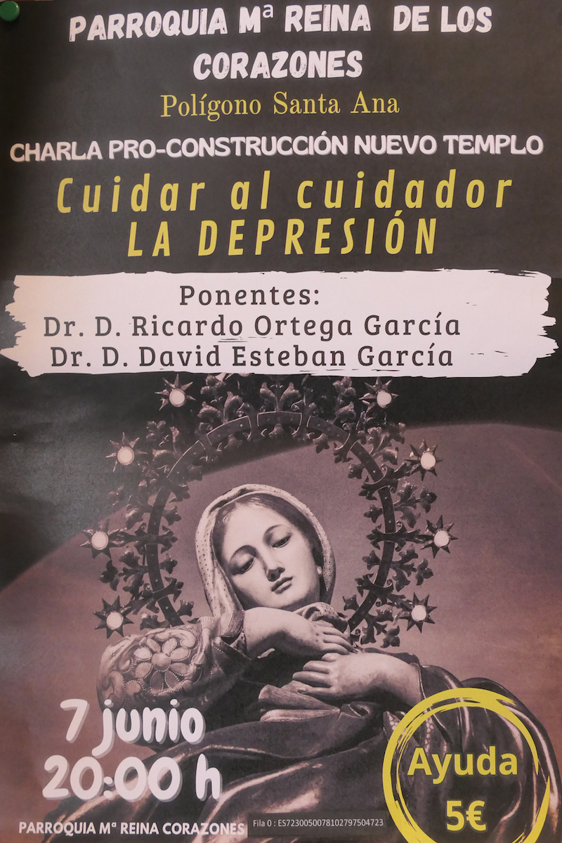 'Cuidar al cuidador - La depresión' es el tema del coloquio que tendrá lugar hoy, a las 20 horas, en la barriada de Cartagena Norte, con Ricardo Ortega garcía y David Estaban García como ponentes, organizada por la parroquia de María Reina de los Corazones y que forma parte de las iniciativas para recaudar fondos a destinar a las obras que se llevan a cabo para la nueva iglesia, como fue el mercadillo que se estrenó en la tarde del pasado sábado.