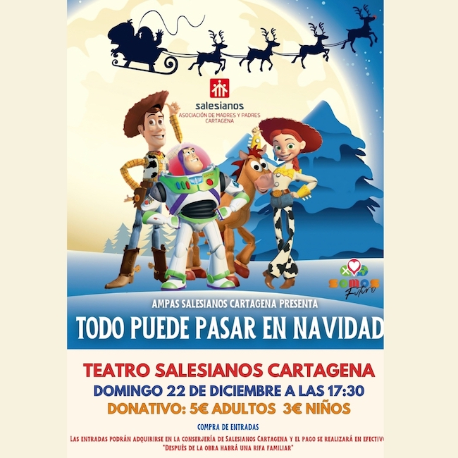 El salón de actos del colegio de la Barriada de Hispanoamérica-Los dolores acoge en la tarde del domingo la divertida representación de 'Todo puede pasar en Navidad' con las aventuras de los conocidos juguetes de 'Toy Story' para salir de los líos en que se meten. Al acabar la puesta en escena habrá una rifa familiar con grandes premios.