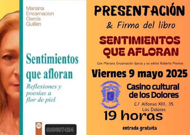 Es la obra con la que Mariana Encarnación García Guillén, vecina de El Algar, ofrece reflexiones y poesías 'a flor de piel' y que será presentada esta tarde en el Casino Cultural de Los Dolores con presencia de la autora y el editor, siendo la entrada gratuita para los interesados.