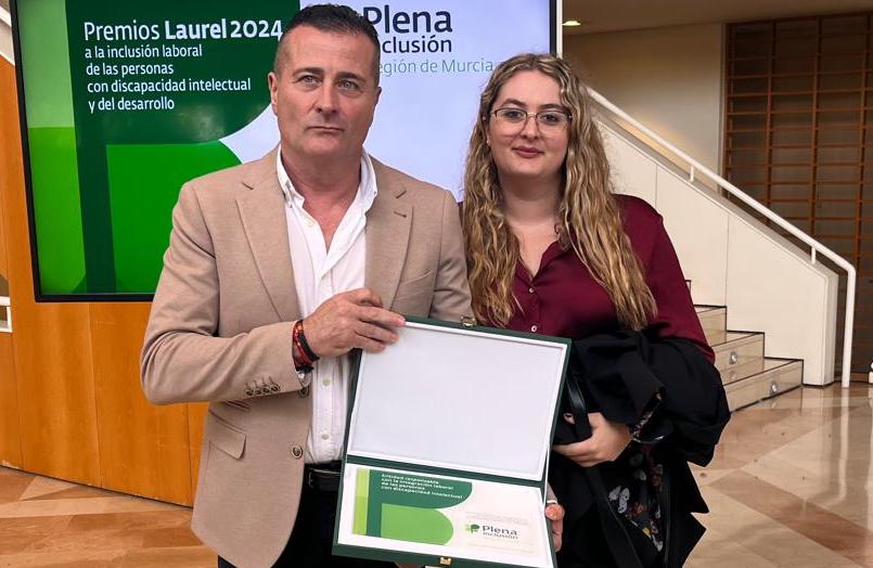 La imprenta cartagenera ha sido distinguida en la vigésimo octava edición de los premios anuales de 'Plena Inclusión Región de Murcia', que se han celebrado en el auditorio Víctor Villegas de Murcia. En la imagen se observa a Manuel Cánovas Caparrós (gerente) y Victoria Cánovas Martínez, como representante de la empresa ubicada en el Polígono Santa Ana, con la placa de honor recibida.