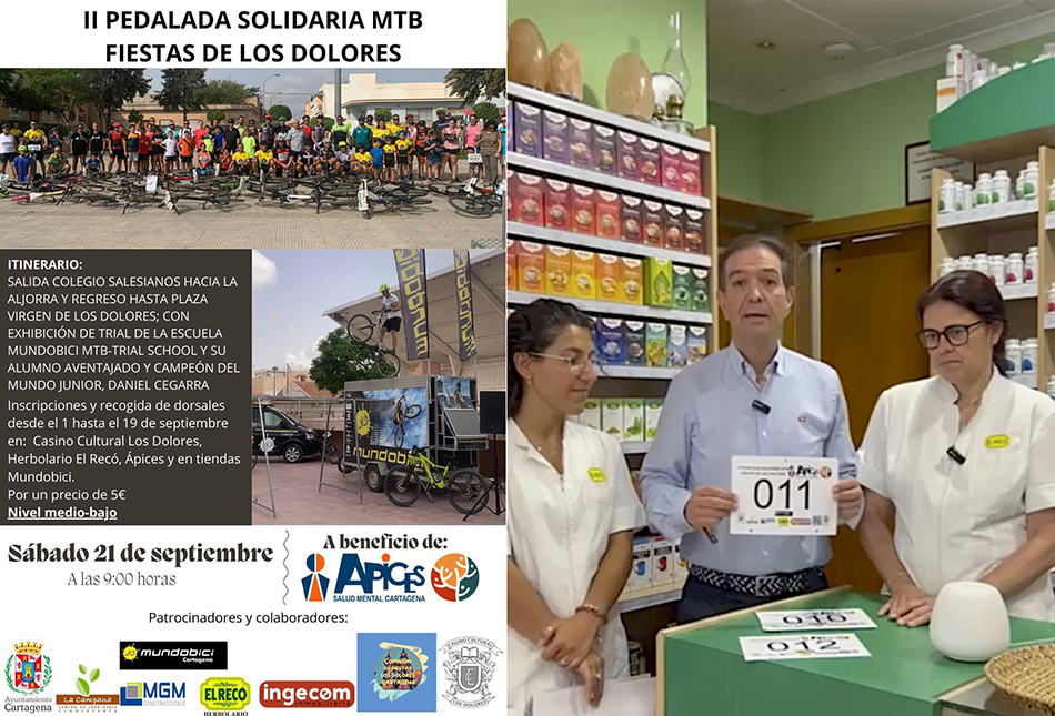 La segunda edición, que fue suspendida en septiembre por la lluvia, se celebrará el 10 de noviembre para ayudar con la labor de ÁPICES Salud Mental. Los dorsales ya se pueden recoger en el Casino Cultural de Los Dolores (entidad organizadora del evento), Herbolario El Recó (frente a los juzgados de Cartagena), ÁPICES en Santa Ana y en las tiendas Mundobici.