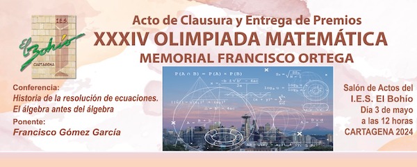El instituto El Bohío acoge este viernes el acto de clausura y entrega del trigésimo cuarta edición del concurso regional del 'Memorial Francisco Ortega'. Comenzará a las 12 horas e incluye la conferencia 'Historia de la resolución de educaciones. El álgebra antes del álgebra', que ofrecerá Francisco Gómez García.