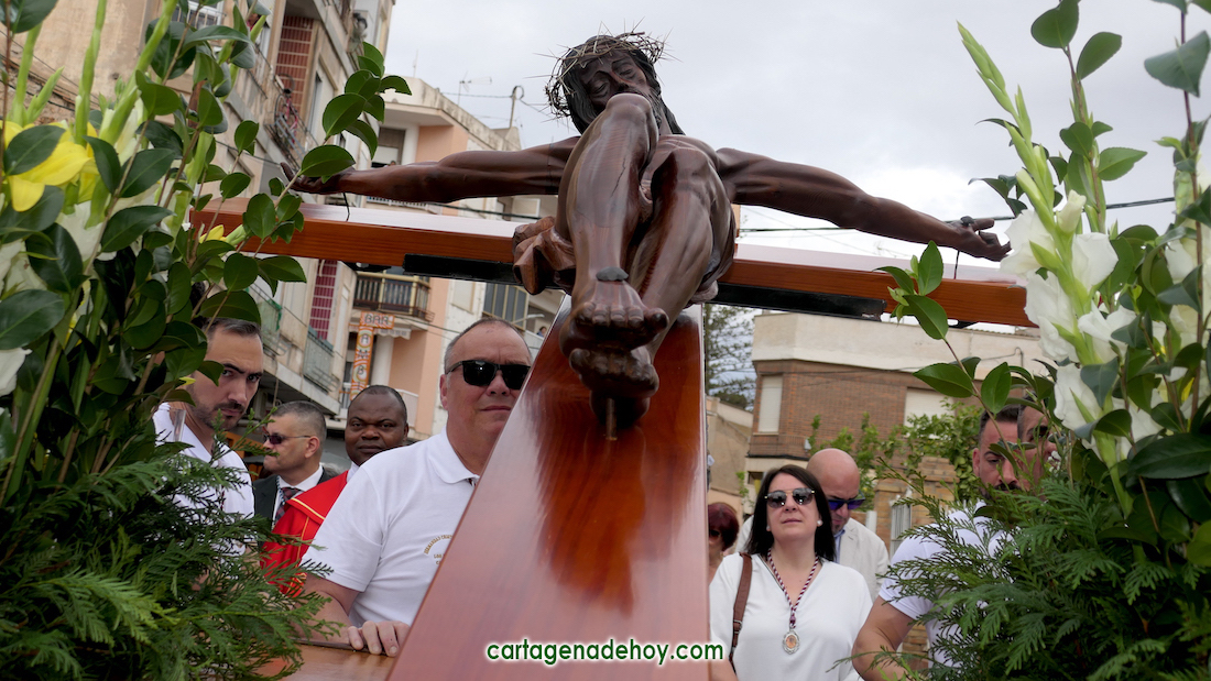 La imagen del crucificado de la parroquia de la calle Soledad, dentro de sus fiestas anuales, ha protagonizado la séptima procesión con música procesionista, una estela de fieles y mejoras en varios aspectos.