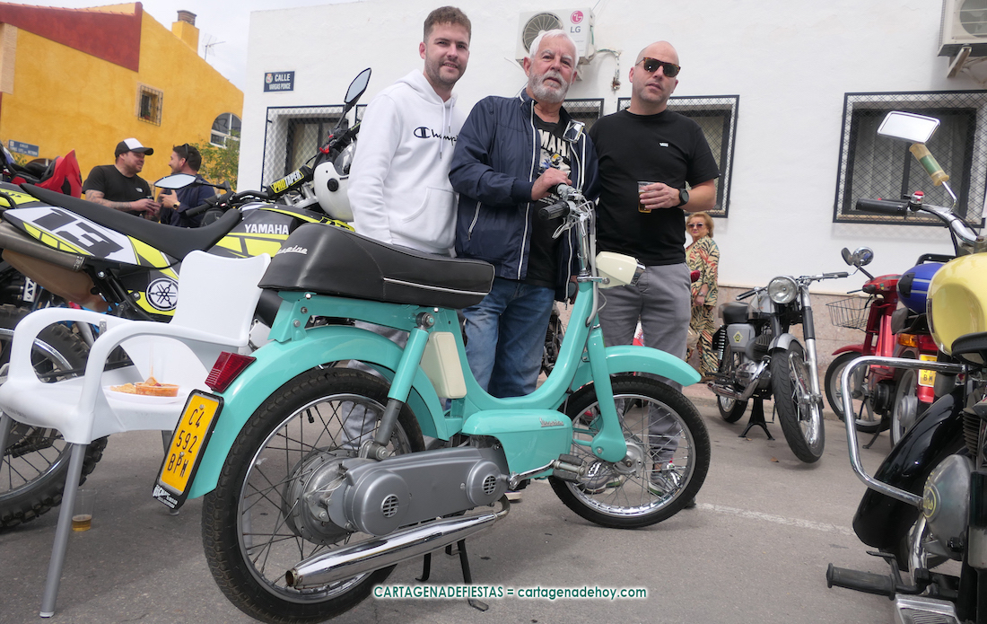 El dolorense Juan Calderón participó en la segunda edición de la concentración de vehículos clásicos de San José Obrero con una Vespino Brisa de más de medio siglo de historia. La compró, siendo aún menor de edad, en junio de 1972 por 10.500 pesetas con motivo de su onomástica y, gracias a su mantenimiento, continúa con esta montura. En la foto posa con sus hijos Juan y Fran.