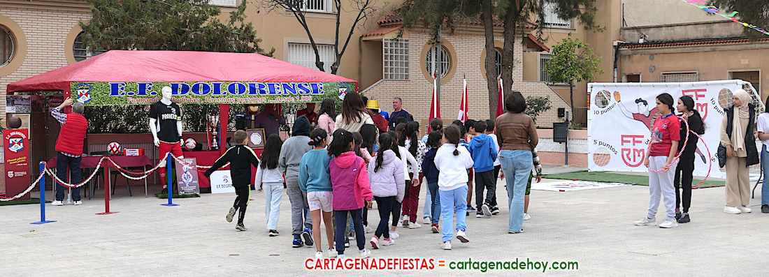 La plaza más emblemática del populoso barrio de Los Dolores ha recibido esta mañana a alumnos de diversos centros docentes de Cartagena Norte para visitar los estand del CD Dolorense, Asociación Fitra, Cáritas, Centro de Salud, centro intercultural y de varios colegios e institutos.