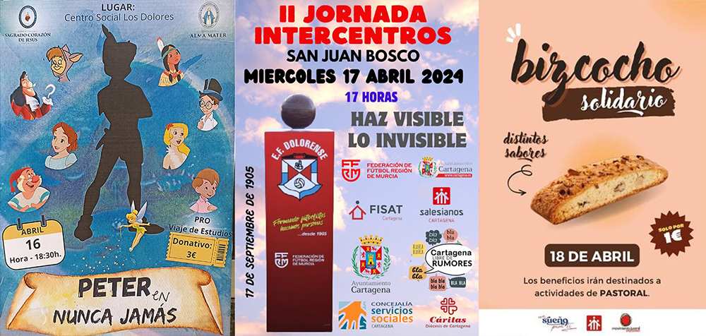 El local social acoge esta tarde la representación de 'Peter en Nunca Jamás', mientras que mañana tiene lugar en el campo San Juan Bosco el segundo campeonato intercentros de los barrios de Cartagena Norte. El jueves, además, se desarrolla en Salesianos el 'Bizcocho solidario de Pascua'.  También indicar que la charla sobre moda modernista que iba a tener lugar este jueves en el local social dolorense se aplaza hasta nueva fecha.