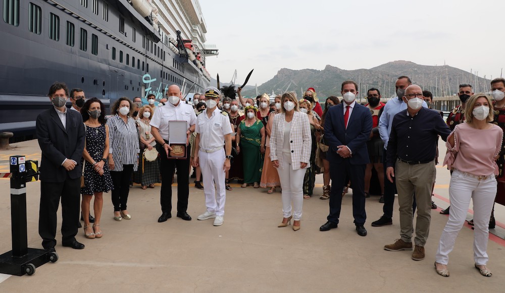 La presidenta de la Autoridad Portuaria estuvo acompañada por la alcaldesa del municipio, Noelia Arroyo, el director general de Competitividad y Calidad Turística, Carlos Peñafiel, el teniente alcalde, Manuel Padin, y el representante de la consignataria Agencia Marítima Blázquez, Javier Sánchez, que hicieron entrega de una placa conmemorativa al capitán del buque, Tom Roth, que ha felicitado a las autoridades local, regional y portuaria para solventar las dificultades de la llegada del buque, “todo el personal portuario nos ha facilitado la labor de atraque esta mañana. Y nos ha sorprendido la riqueza de colores a la entrada a la dársena”.