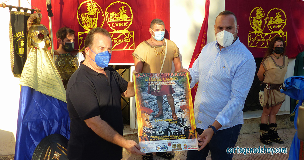 Eduardo Conesa, como vicepresidente de la Federación de Tropas y Legiones, destacó la presencia en el pueblo “de muchos festeros de pro”, para a continuación destapar el cartel de esta salida del fuego sagrado junto a su autor, José María García, quien explicó a los asistentes que su obra representa “la luz del camino, con un centurión avanzado sobre la vía Ylada, rodeada de esparto. En los laterales, el fuego y dos casos, uno romano y otro carthaginés y el lema ‘Recorrámoslo juntos’, completado el cartel en su parte inferior por por los monumentos y símbolos de La Aparecida”.