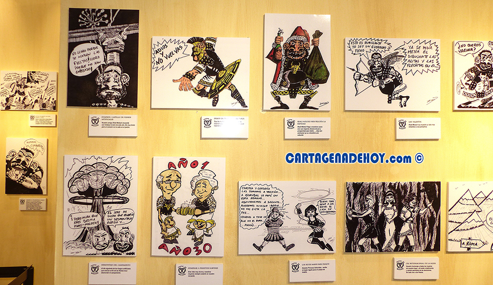 Joaquín Moya de la Torre y Cerón, festero de Tropas de Magón y cronista oficial festero, protagoniza la exposición de treinta y siete viñetas sobre Carthagineses y Romanos que acoge El Corte Inglés, en la que los simpáticos textos y gestos arrancan numerosas sonrisas. El organizador de la muestra es su compañero Lorenzo Jerez. Estas obras surgieron durante el confinamiento por la pandemia: "Querían hacer reír a personas que estaban solas", explica.