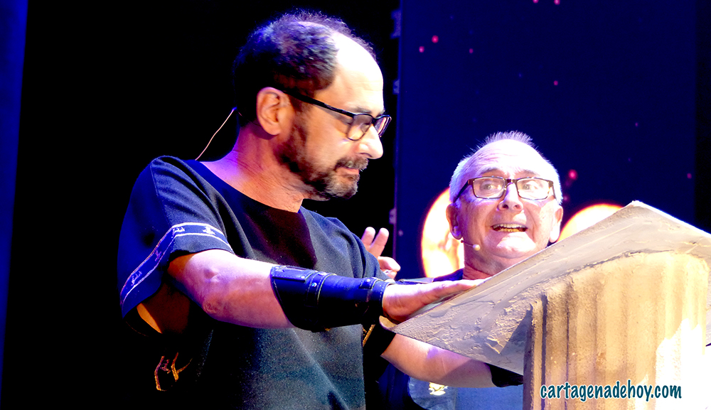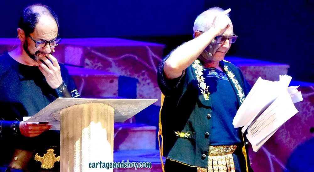 Jordi Sánchez y Xavier Deltell, a las diez menos veinte de la noche, aparecieron en el escenario con vestuario carthaginés el primero y de romano el segundo, aunque con una chaqueta huertana, que ya marcaba lo que vendría después, cuando el primero comenzó a lanzar ‘bordesicos dardos’ al segundo, quien los repelía, pero siempre condicionado por los aplausos de los asistentes a los ataques hacia los habitantes que están detrás del ‘puerto de la condena’, como dijeron. También hicieron alusiones al afán murciano de quedárselo todo, a que en muchos informativos utilizan mucho la palabra ‘murciano o murciana’ para referirse a la costa u otras zonas de la Región alejadas de la capital, a que cuando Carthago Nova era capital de media España “Murcia no era ni una lechería”… y hasta sacaron el fútbol: “El Cartagena está en segunda división y el Murcia no se sabe dónde cojones está”.
