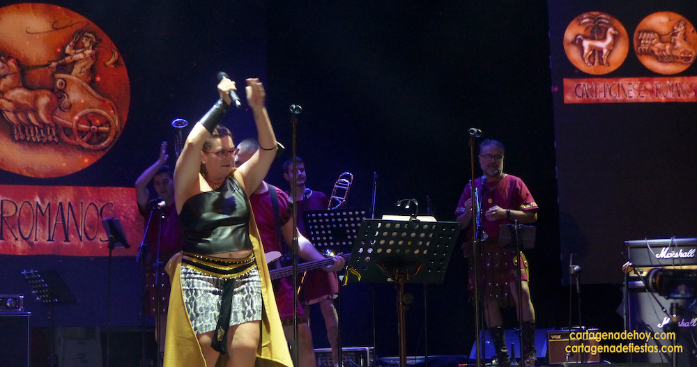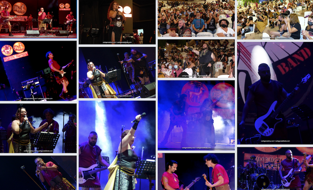 El estratega carthaginés cambia la falcata por el micrófono y la guitarra eléctrica para un concierto ‘único e irrepetible’ de la banda ‘Carthago Big Band’, formada por integrantes del grupo festero Tropas de Aníbal con el refuerzo de otros grupos púnicos, ante un numeroso público en el Parque Torres. El broche se puso con una canción con letra versionada a la situación actual y que interpretó el general arropado por representantes de las veinticinco tropas.