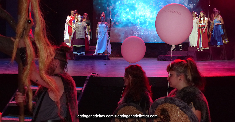 Minutos después de las nueve de la noche comenzaba la actividad en el auditorio ‘Paco Martín’ del Parque Torres con los mensajes de la asociación benéfica y apostólica ‘Cartagena por la Caridad’ y de la asociación ‘Hipocampus’, dos de las diez entidades a las que irá el dinero recaudado por la taquilla de la venta de entradas. Aunque esas proyecciones han estado cada día, esta vez no era una jornada más. Era la última del Annus XXXII, el ‘Año de la esperanza’, en la que se ha regresado de forma parcial. Un acróbata ha actuado en esos inicios del acto de clausura, llegando después los dioses y los personajes infantiles y adultos, estos últimos bajando por las escaleras entre el público.