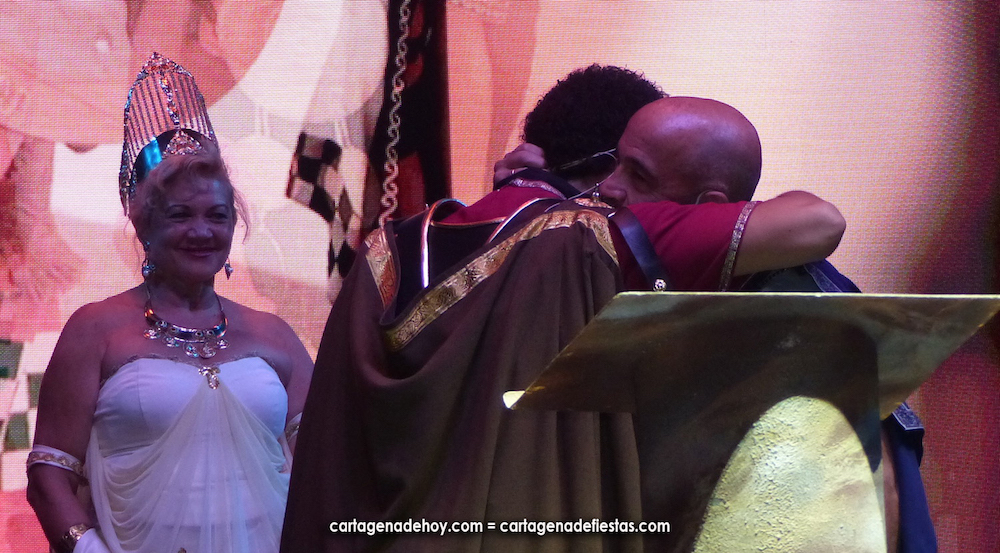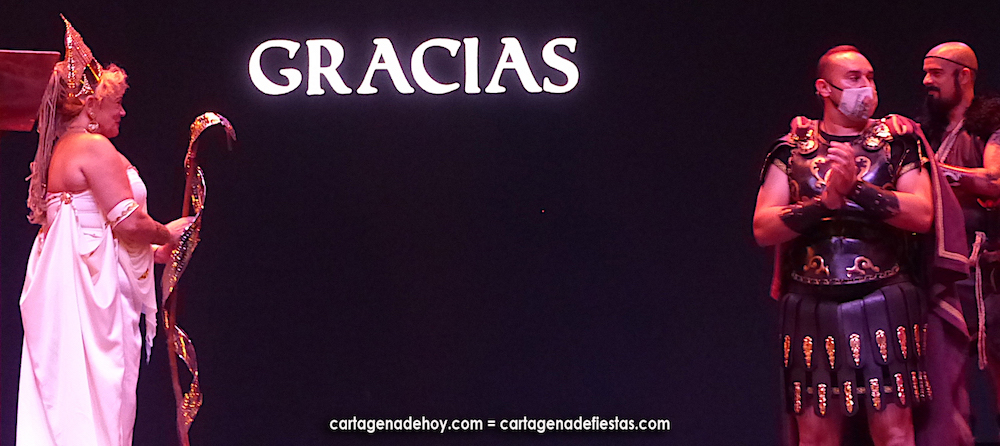 Carmen Pareja (Himilce) ha mostrado la emoción que sentía en ese lugar, el auditorio, “que ha dado a nuestros actos una magia especial”, ha dicho, pero matizando que los festeros “sabemos que nos falta algo”, desenado que en 2022 sea el ‘año del resurgir’ con un disfrute total y con “el latido del campamento”. Víctor Nieto (Aníbal) ha expresado que se despiden “unas fiestas diferentes,en las que hemos sentido que nos falta algo”, añadiendo que mantienen la esperanza “de vovler a disfrutarlas como las conocemos”. También se refirió al futuro, “pues no hemos tocado techo y hay que trabajar para seguir creciendo”. Ha concluido dirigiéndose a Adil Mata (Escipión), “la historia nos hizo enemigos y las fiestas, hermanos”. El romano ha sido quien después se ha dirigido al público para dar las gracias “en mayúsculas a todos”, resaltando el valor de las personas “cuando desaparece el ego”, reitrando sus “infinitas gracias a todos los que habéis formado parte de ese camino”. Ana Gómez (Emilia Paula) ha cerrado desvelando que se llegaba “al final de un largo recorrido, donde he llorado y vivido como una patricia romana. De mujer a mujer, gracias Emilia Paula”. Los vivas a Cartagena y a las fiestas han cerrado las alocuciones de cada uno entre ovaciones del público. Recordar que los cuatro han finalizado las dos ediciones encarnando a los personajes principales de las fiestas y serán nuevos rostros los que los representen, salvo imprevistos, en 2023.