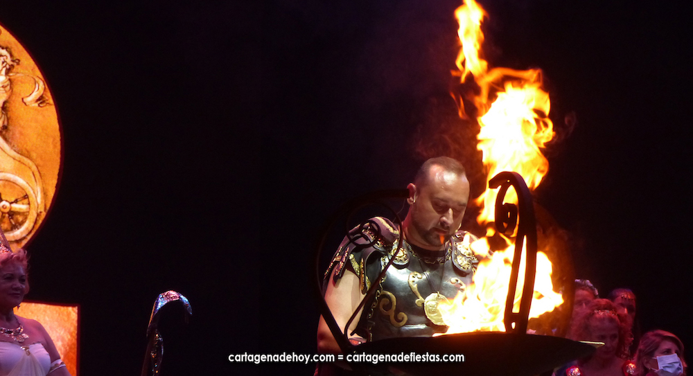 Un legionario romano y un guerrero carthaginés, con sendas antorchas, recogieron el fuego sagrado y se dirigieron a las esquinas superiores del auditorio, donde estaban los lábaros (además de globos blancos) de sus respectivos bandos. Después llegó el apagado del pebetero a cargo de los mismos pueblos donde se encendieron el 17 de septiembre. Pedro López, como alcalde de La Unión, y Juan Manuel Ayaso, como presidente de la Junta Vecinal de La Aparecida, han sido quienes ha ahogado una llama algo rebelde a ser apagada.