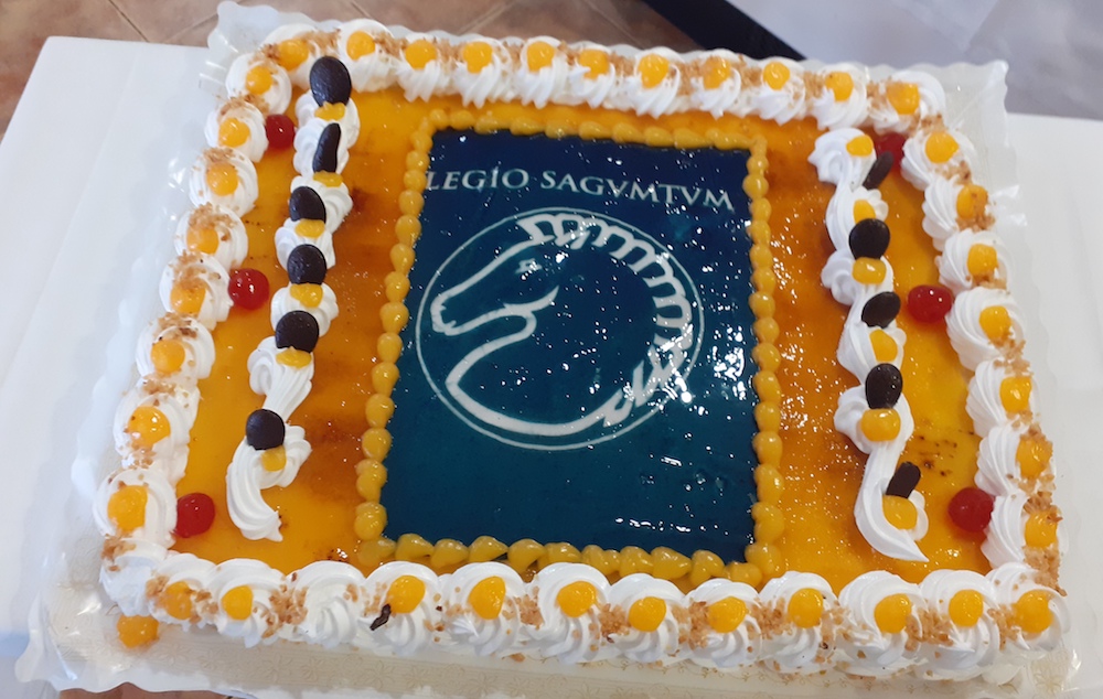 Buena parte de los integrantes de esta gran familia saguntina confluyeron en el Restaurante Marín del polígono industrial de Los Camachos, donde derrocharon una jornada de plena convivencia cargada de humor, entrega de distinciones y de regalos y, entre otros detalles, una tarta con el escudo del emblemático caballo alado 'Pegaso' que fue cortada por Alfonso Martínez, director de la obra 'Destrucción de Sagunto', representada el domingo 19 en el Parque Torres.