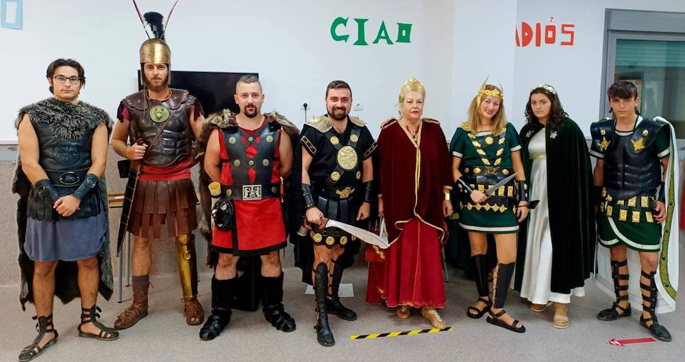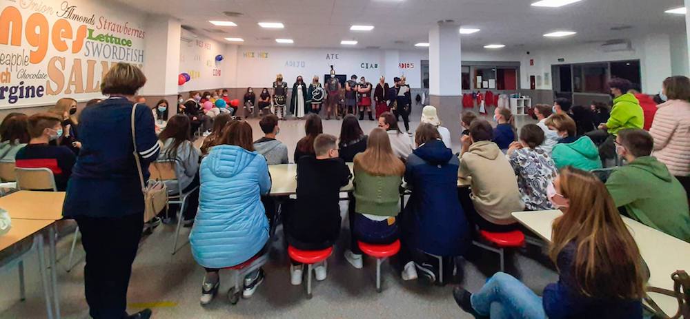 Un grupo de festejadores del área de relaciones externas de la Federación de Tropas y Legiones acudieron al colegio Miralmonte del Polígono Santa Ana para ofrecer una muestras de las históricas fiestas cartageneras a alumnos venidos de Italia, Lituania, Eslovenia y Finlancia del ‘Erasmus+ - Debating As A New Approach of Learning’, además de estudiantes españoles.