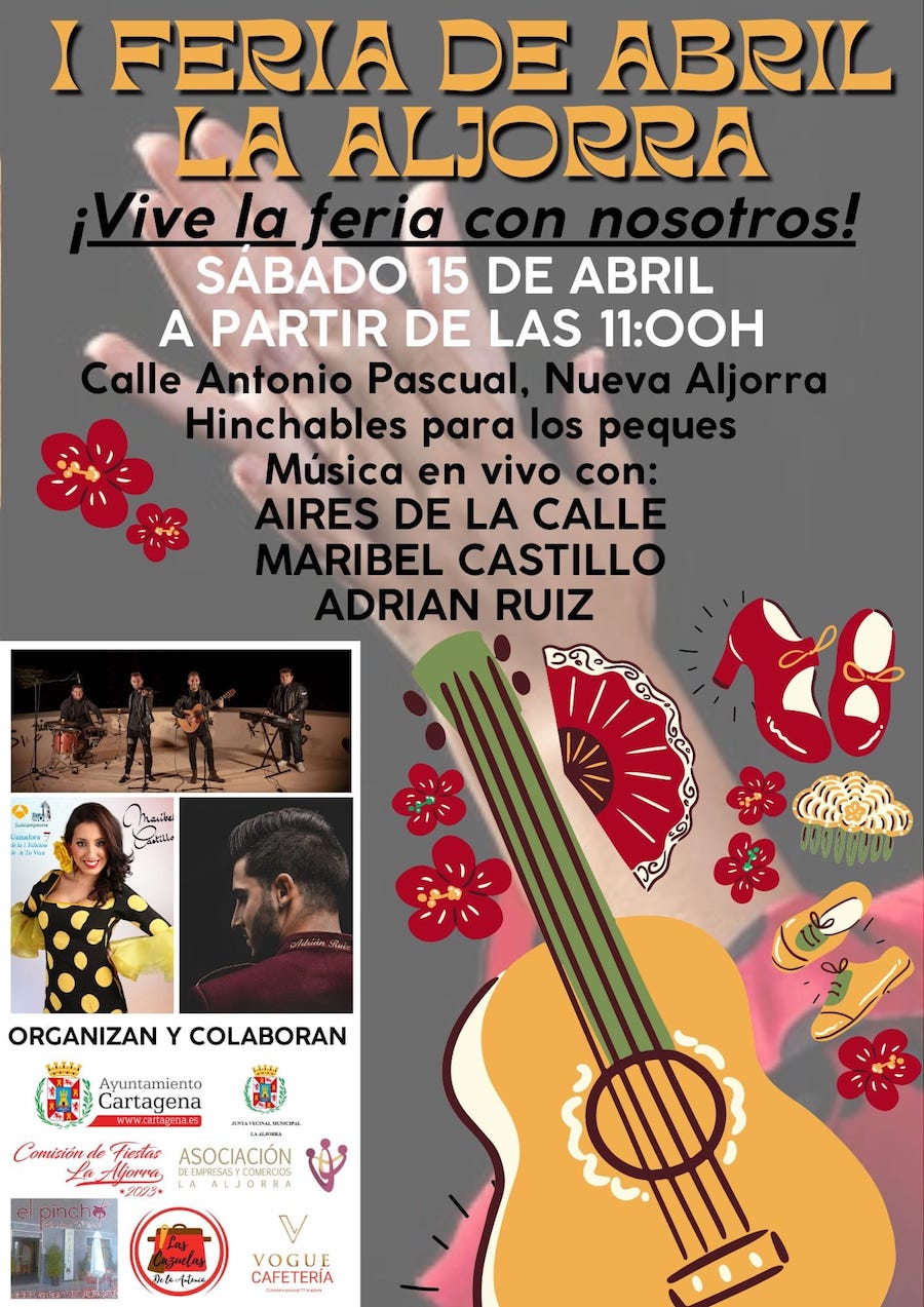 A las once de la mañana comenzará la actividad de la primera edición de la ‘Feria de abril’ que se desarrollará en la calle Antonio Pascual (Nueva Aljorra) y que contará con la música en directo de ‘Aires de la calle’, Maribel Castillo y Adrián Ruiz.