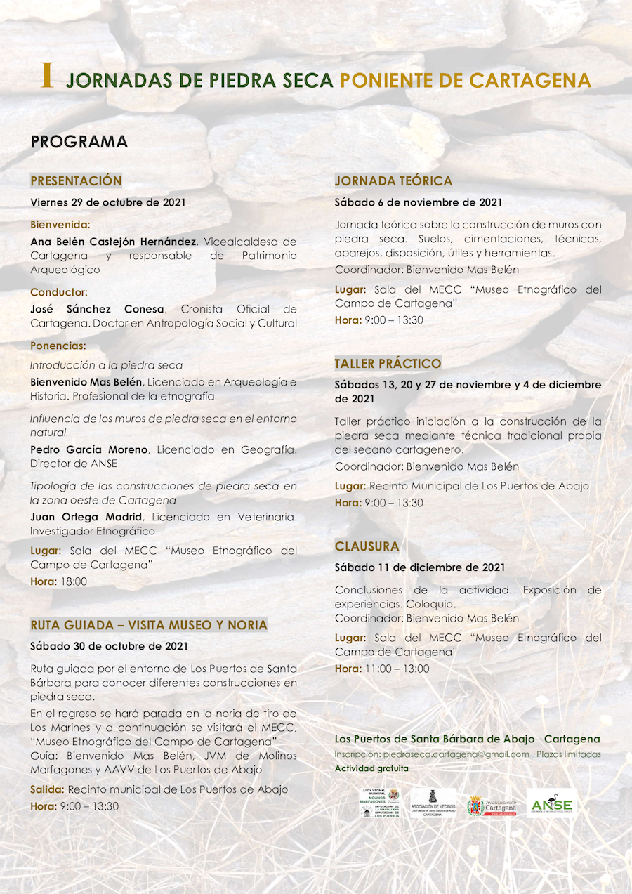 El paisaje del Campo de Cartagena está plagado de elementos arquitectónicos que lo hacen único. Uno de ellos son las construcciones elaboradas tradicionalmente con dicho material y que se pueden encontrar formando muros o aterrazamiento de bancales. Sobre esta temática se desarrollarán las actividades que se han programado del 29 de octubre al 11 de noviembre en el Museo Etnográfico de Los Puertos de Santa Bárbara.