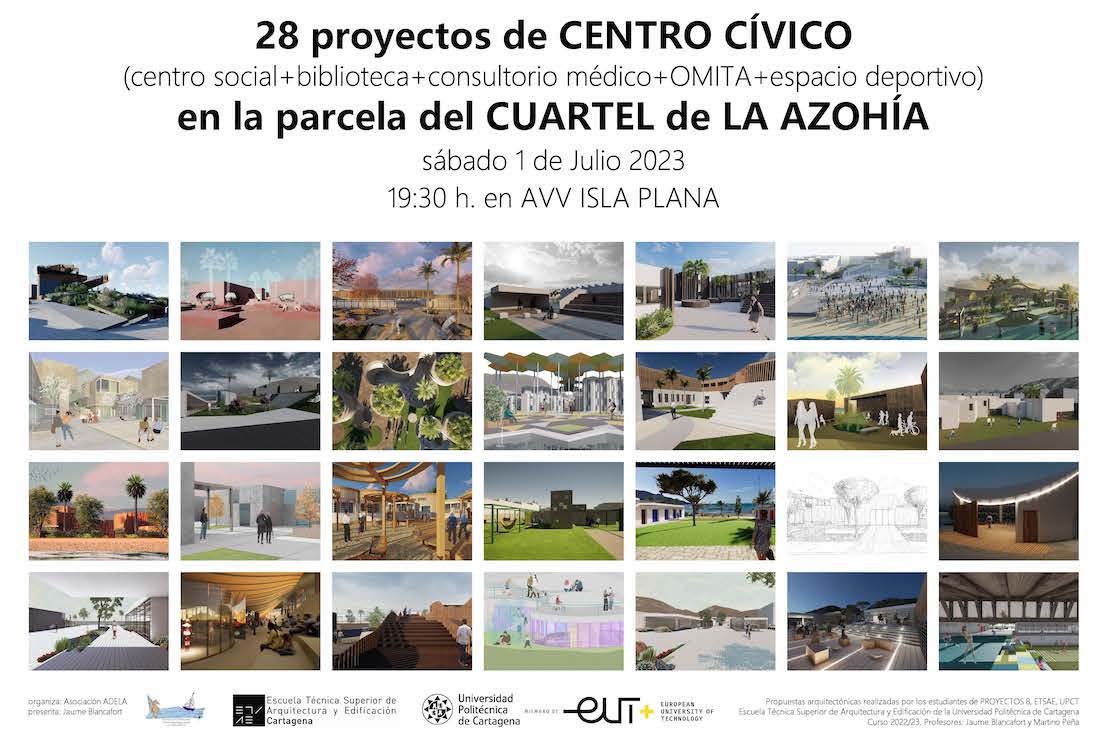 La Asociación de Vecinos de Isla Plana acoge este sábado (19.30 horas) una muestra de 28 proyectos de centro cívico (centro social + biblioteca + consultorio médico + OMITA + área deportiva) elaborados por universitarios para el terreno que ocupó la Guardia Civil y por el que vienen luchando desde hace lustros para que potencie los servicios en el pueblo. La exposición contará con las explicaciones de Jaume Blanca fort, profesor de la UPCT.