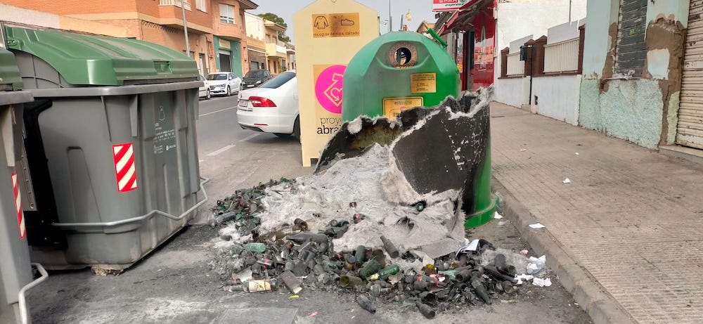 Aunque ya ha pasado la noche de San Juan, todavía surgen nuevos brotes de daños a elementos públicos, que bien pueden deberse a gamberradas como a acto incívicos intencionados. En este caso, en la avenida principal de pueblo del oeste cartagenero, ha ardido un contenedor de vidrio.
