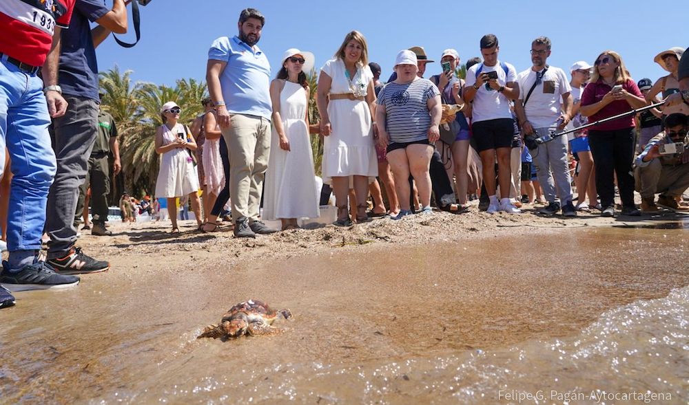 Durante la suelta, en la que también participaron la alcaldesa de Cartagena, Noelia Arroyo, y usuarios de la Asociación Prometeo de personas con discapacidad, física, psíquica y sensorial, López Miras destacó que “en los últimos diez años se han liberado a 133 ejemplares de tortuga boba”, entre las nacidas de manera natural en el litoral de la Región de Murcia y las recuperadas en el Centro de Recuperación de Fauna Silvestre de El Valle, y añadió que esto es posible “gracias a la colaboración en cadena que implica a toda la Región de Murcia”.