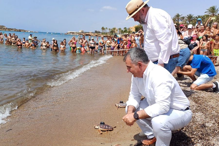 El consejero de Medio Ambiente, Universidades, Investigación y Mar Menor, Juan María Vázquez, junto al concejal de Patrimonio y Medio Ambiente del Ayuntamiento de Cartagena, Pablo Braquehais, realizó hoy la liberación de una veintena de ejemplares de tortuga boba en la playa Grande de Isla Plana, en Cartagena.