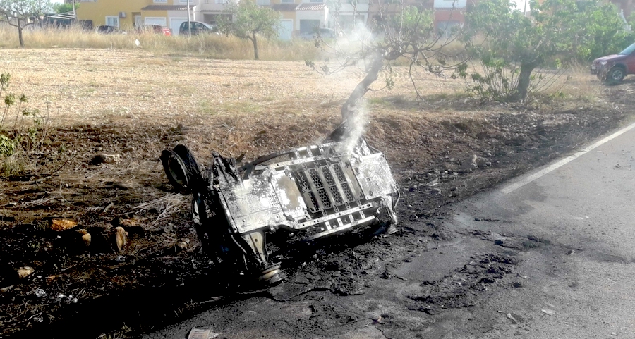 Bomberos del Ayuntamiento de Cartagena extinguieron en la tarde del domingo el incendio de un coche eléctrico monoplaza en Molinos Marfagones. A la llegada del personal de emergencias, el vehículo ya estaba totalmente calcinado y la batería no dejaba de humear e incendiarse de forma continuada. Las llamas también se propagaron por el terreno donde tuvo lugar el suceso.