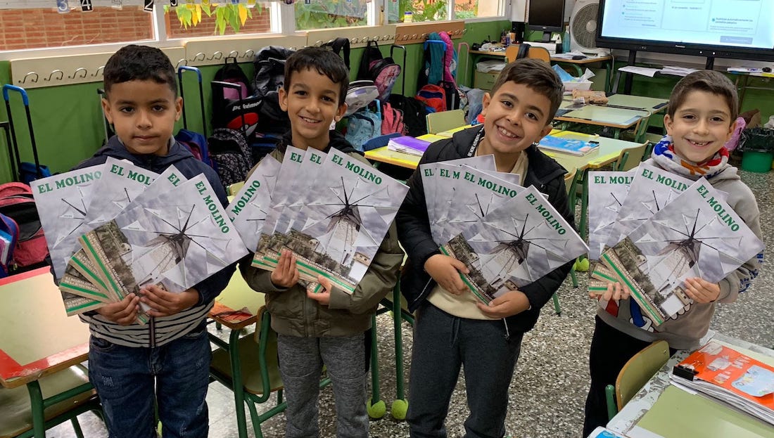 Catorce ejemplares de la publicación en papel editada por la Junta Vecinal Municipal de Perín-Campo Nubla y elaborado por 21DEhoy agenCYA fue material de trabajo para los alumnos del colegio de José María Lapuerta tanto para conocer esta zona de Cartagena como para aprender a leer una revista, siendo la primera que utilizaban algunos de los escolares.