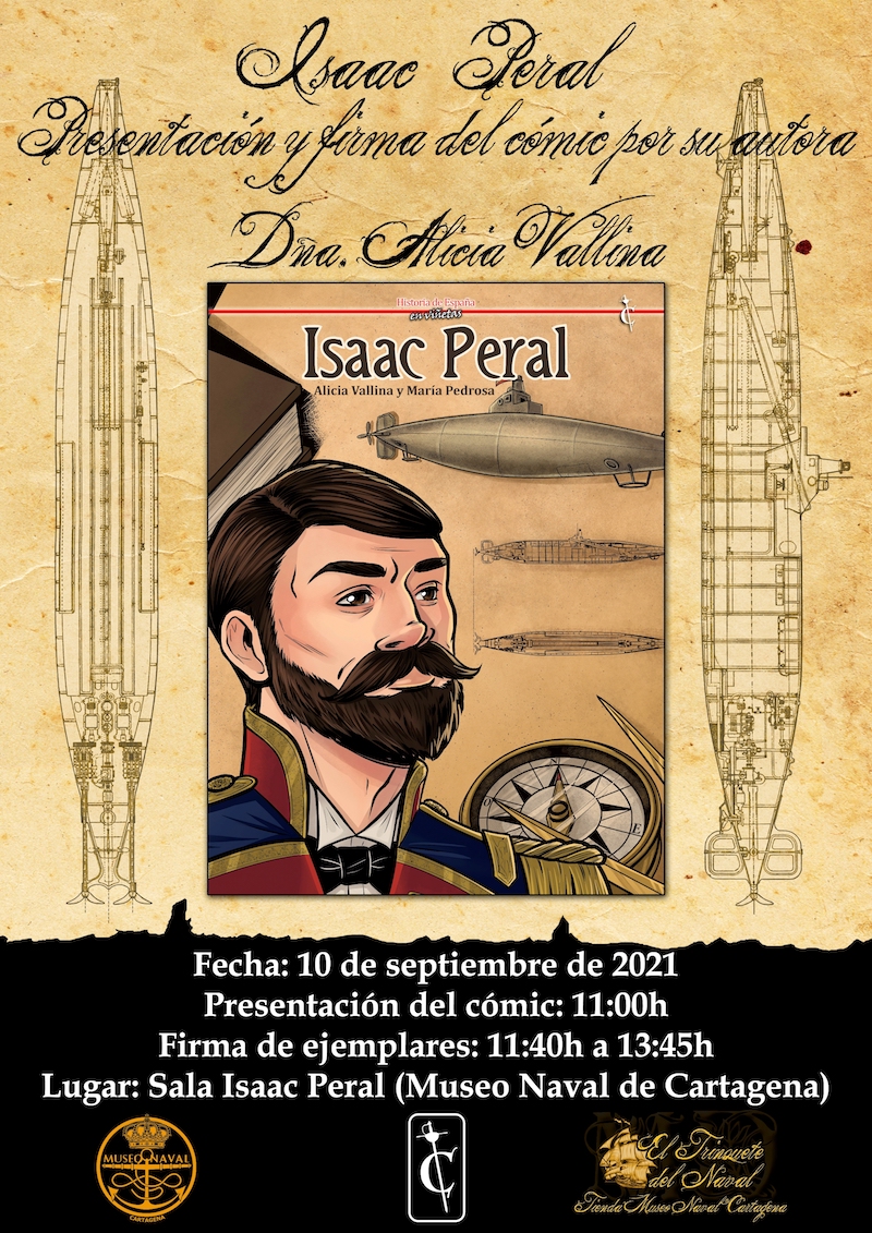 El insigne inventor y marino cartagenero protagoniza un tebeo creado por Alicia Vallina, doctora en conservación y patrimonio, conservadora de museos y coordinadora técnica de la unidad de Coordinación de Museos de la subdirección general de Publicaciones y Patrimonio Cultural Ministerio de Defensa, el cual será presentado este próximo viernes en la sala Isaac Peral del Museo Naval, coincidiendo con la semana de la efeméride del 133 aniversario de la puesta a flote del Submarino Peral, que fue el 8 de septiembre de 1888.