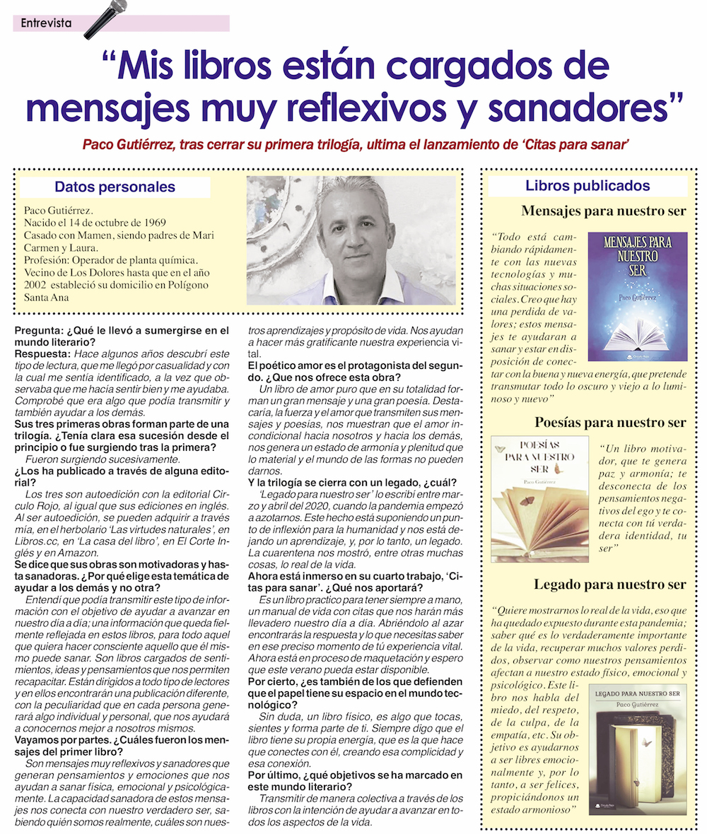 El escritor presenta esta tarde, a las 20 horas en el herbolario 'Botica las virtudes naturales' de la calle de Alfonso XIII de Los Dolores, su trilogía 'Para nuestro ser' y su nuevo libro, 'Citas para sanar'.