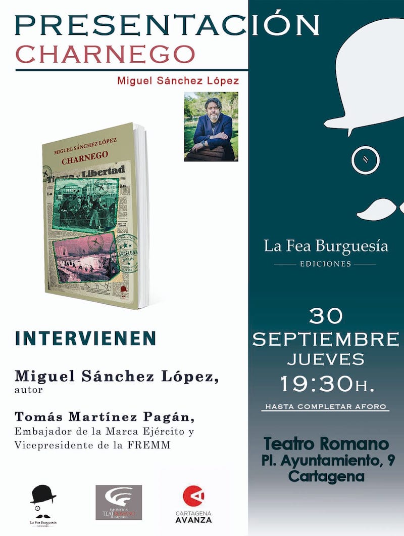 La Fea Burguesía Ediciones presenta la novela 'Charnego', de Miguel Sánchez el próximo 30 de septiembre en el Teatro Romano de Cartagena. Acompañará al autor en esta nueva presentación Tomás Martínez Pagán, embajador de la Marca Ejército y vicepresidente de la FREMM en un acto que dará comienzo a las 19:30 horas.