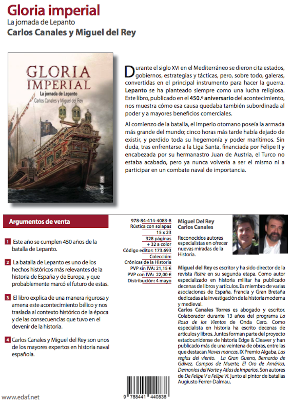 ... pues también supuso una lucha de poder y la búsqueda de beneficios comerciales. Así lo expusieron Miguel del Rey y Carlos Canales en la presentación de su libro 'Gloria imperial. La jornada de Lepanto', que recoge de forma rigurosa este acontecimiento de la historia que tuvo lugar hace 450 años. El acto tuvo lugar en el salón de actos del Archivo Municipal ubicado en el Parque de Artillería de Cartagena, que rozó el lleno de su aforo y que contó con la presencia de mandos de distintos cuerpos y unidades militares.
