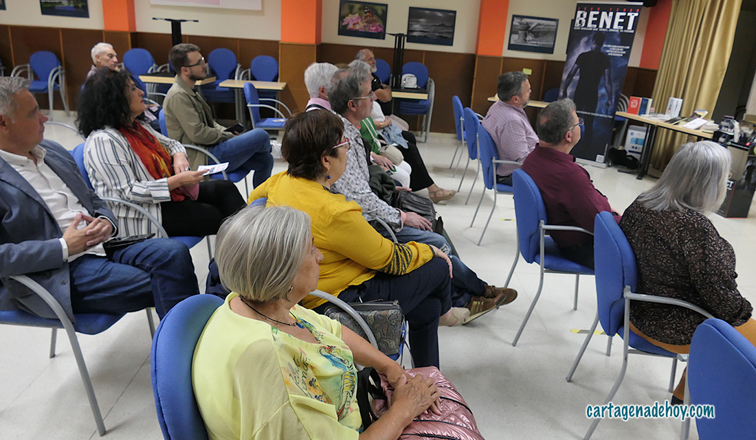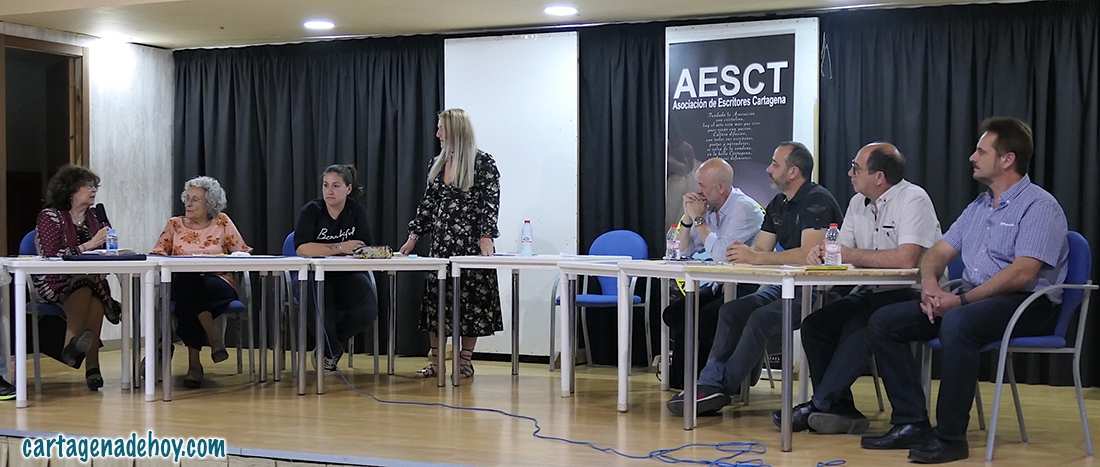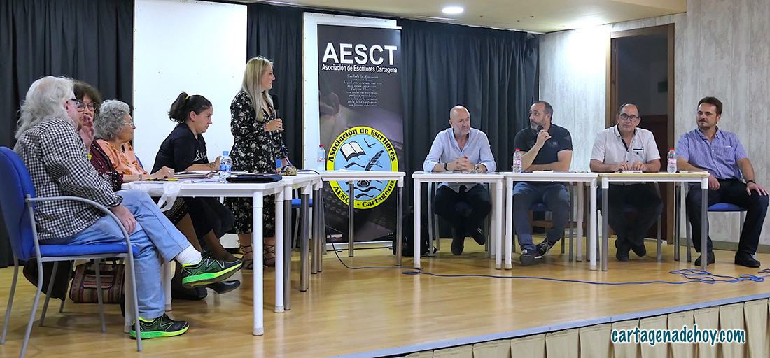 Estrella Díaz, de una manera muy fluida, fue la encargada de moderar el encuentro organizado por la Asociación de Escritores de Cartagena (AESCT) en el local social de Los Dolores, dentro de la tercera jornada de la Semana Cultural organizada por la asociación de vecinos.