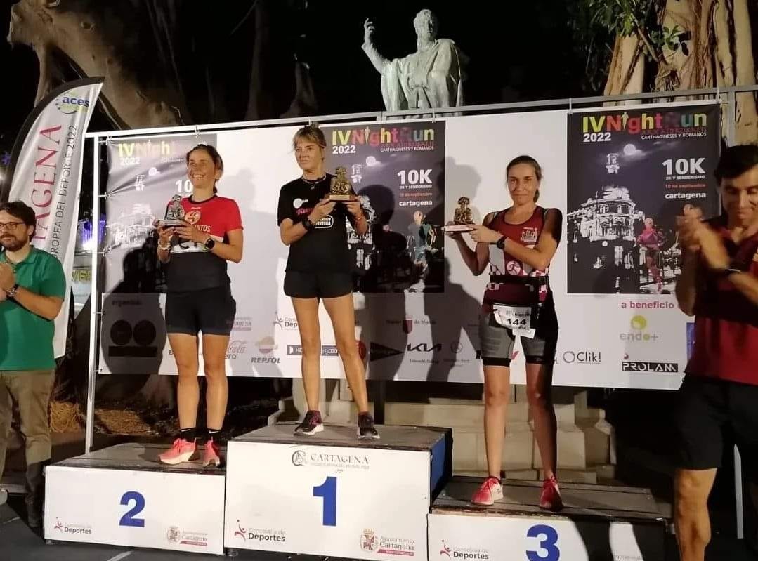 Logró la victoria absoluta en la cuarta edición de la carrera que organiza la Federación de Tropas y Legiones, siendo María Garnes la primera fémina, mientras que Juan Antonio Zamora, Francisco Díaz Pozo, Eduardo Escolar y Jorge García ganaron, respectivamente, en máster-40, sénior, máster-60 y promesas, mientras que Aaron Laencina triunfó en la prueba ‘Jóvenes guerreros’. En la imagen, el podio femenino.
