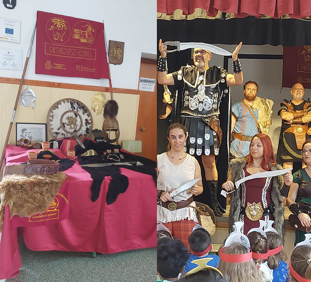 El estratega y una representación varias tropas carthaginesas han visitado el colegio Azorín de Molinos Marfagones para explica la base histórica de las fiestas y en qué consiste su popular celebración anual.