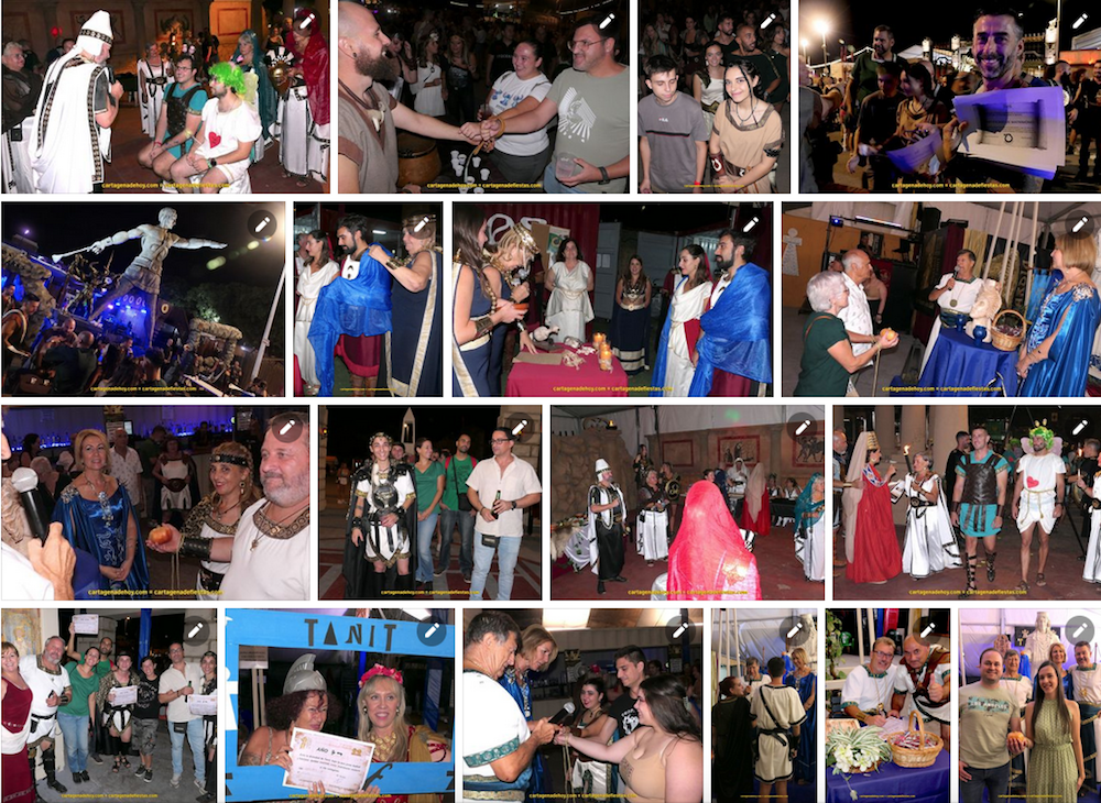 Caballeros e Isis de Carthago, como tropa sacerdotal, fue la que inició hace bastantes lustros los enlaces al rito cartaginés, que después se expandieron a casi todos los grupos de la calle púnica de la gran aldea de Carthagineses y Romanos: Guardia de Tanit, Lanceros Hoplitas Libio, Cabellería Lusitana, Tropas de Magón, Mastienos, Reino de Tartesos, Mercenarios de Lobetania, Quart-Hadast, Himilcón, Honderos… Con la esencia común de unir las manos con una cuerda, cada grupo tiene sus singularidades, desde compartir una granadina o echar sal, por citar algunas variantes, además de que cada colectivo monta su propio escenario (algunos con las imagen de dioses Baal, Tanit, Mars Baleáricus, etc.) y ritual. Por supuesto, no falta el beso de los protagonistas ante el altar.