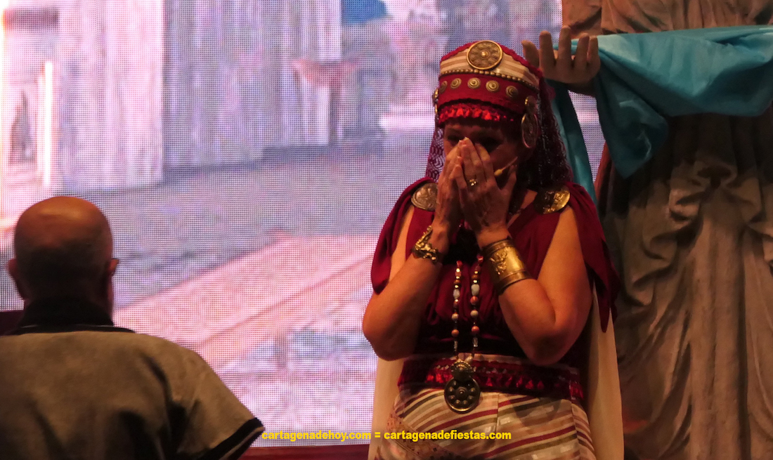 Varios apuntes. El escenario muy similar al del día anterior de ‘Las bodas’, esta vez se produjo algún pequeño desliz de los micrófonos y falta algo más de luz en el pasillo central por el que entran los grupos. Todos estos detalles juntos en absoluto afectan a una estupenda interpretación del grupo de festeros-actores. En ellos, como otra protagonista, Carmen Pareja, quien lucía vestuario íbero algo más sobrio que la jornada anterior. Era su despedida como Himilce en un escenario y quedó al final sola sobre las tablas recibiendo aplausos. No pudo contener la emoción… y entonces apareció ‘su Aníbal’ (Víctor Nieto). Recuperó la calma enseguida, pero los magníficos momentos que ha vivido con el personaje y su ya fuerte corazón cde ADN festero justificaban esa reacción. Enhorabuena por el nivel que está ofreciendo en el papel.