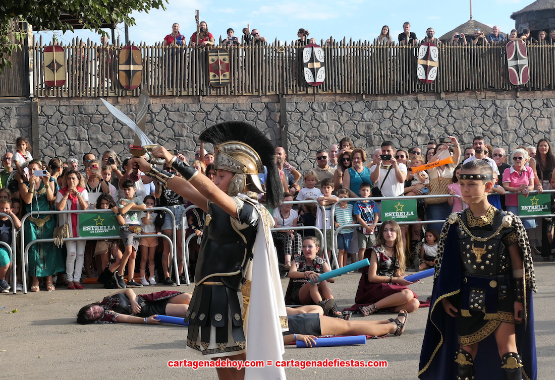 Con dos adultos llevando la ‘voz cantante’ del acto y una lucha entre ambos con gladio, falcata y escudo, el desarrollo ha sido fiel al tradicional gran combate de los festeros mayores en la Cuesta del Batel, con ataques y defensas con escudos, siendo las armas las hondas, balones y, en el momento del choque de fuerzas, las barras de goma en lucha de las espadas.