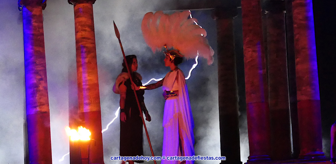La diosa concede al comandante Caio Mucio Escévola su propuesta de ofrecer su vida a cambio de la victoria en la batalla de Roma para conquistar Qart-Hadast, pero vaticina que tendrá una muerte heroica en el combate. La obra, de media hora de duración, pudo el cierre anoche a las representaciones en Plaza Mayor del puerto. GALERÍA DE FOTOS (pinchar aquí)