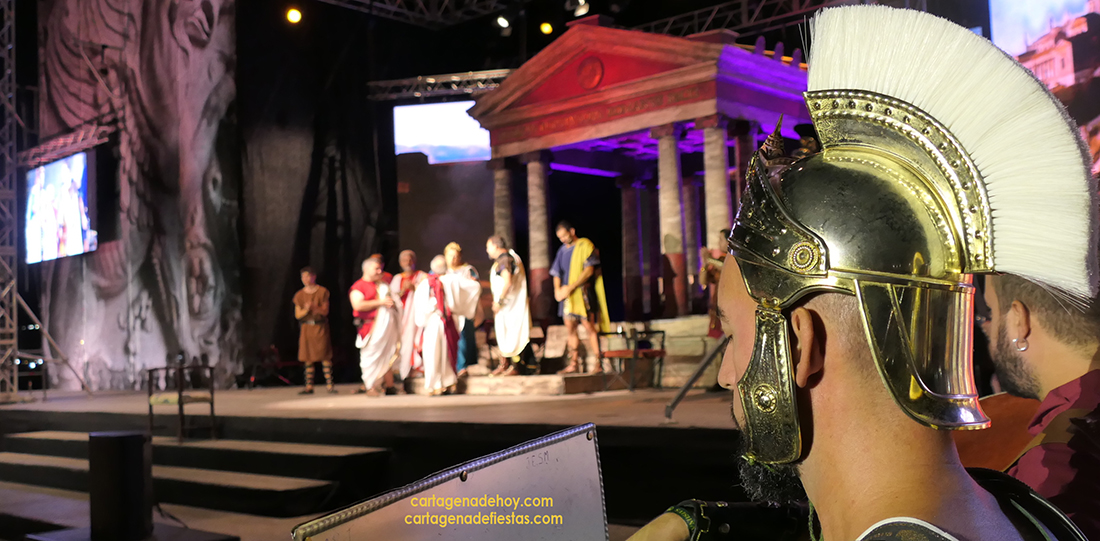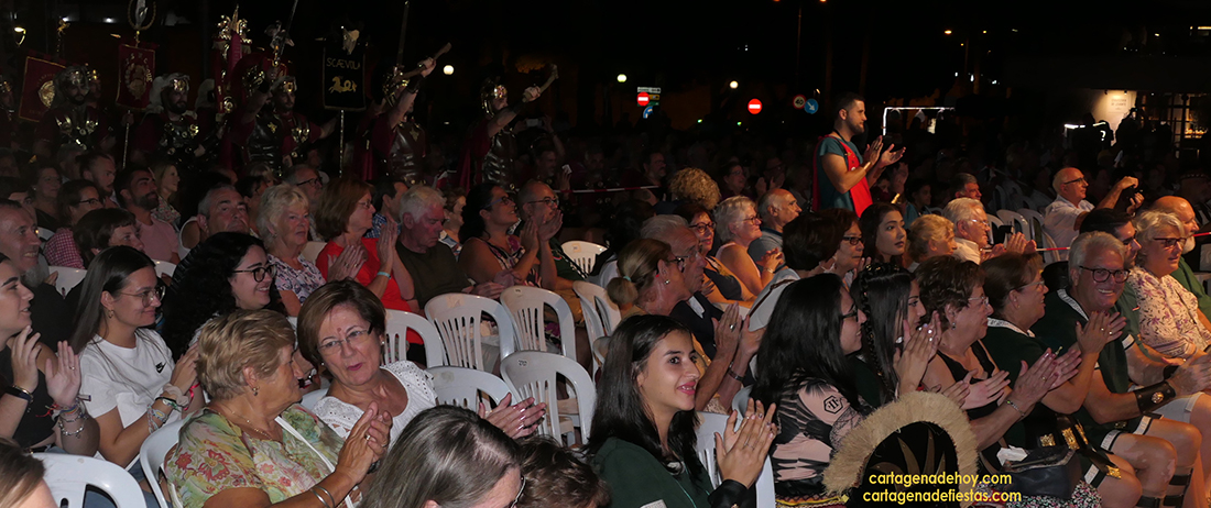 Tras concluir la representación teatral de los comicios, fue llamado Francisco Alarte al escenario. El motivo no era otro que tributarle un justo reconocimiento por su gran interpretación de Escipión en su vejez. “Estoy aquí gracias a Miguel Bastida, que un día me dijo que le ofrecieron un papel que él veía que era para mí. ‘Lo vas a bordar’, me dijo”, comentó, además de recordar que está en las Fiestas de Carthagineses y Romanos desde el Annus I con Collegium Consulum, y poner varias notas simpáticas con su cautivadora voz, como que el vestuario que anoche lució era el de su esposa (también del origen de las fiestas) porque no encontraba el suyo y que había acudido a representar el papel con varias lesiones, como si de ‘heridas de guerra’ se tratase. En concreto, llevaba cinco grapas en la cabeza de un golpe que se dio hace unos días más otras en brazo y pierna. Pese a todo, ahí estuvo, brillando otra vez, junto a su coraza, como el conquistador romano y con la idea de seguir en ese rol muchos años. ‘Ave, Alarte, que así sea’.