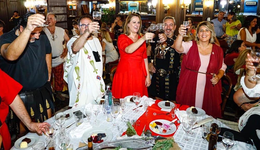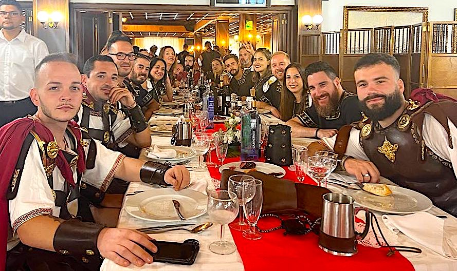 Los guerreros entregaron el ‘Cerdalix’ a los cuatro personajes principales de las Fiestas de Carthagineses y Romanos, mientras que el ‘Cerdalix de la amistad’ fue para el Club Naval de Oficiales, siendo también distinguida la consejera Isabel Franco. Por su parte, se concedió título de honor al recordado Juan José García ‘Kiki’. En la imagen, legionarios de Escipión en el popular banquete, donde asiste una amplia representación de los grupos festeros.
