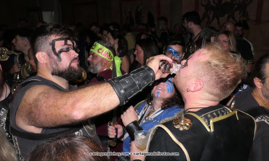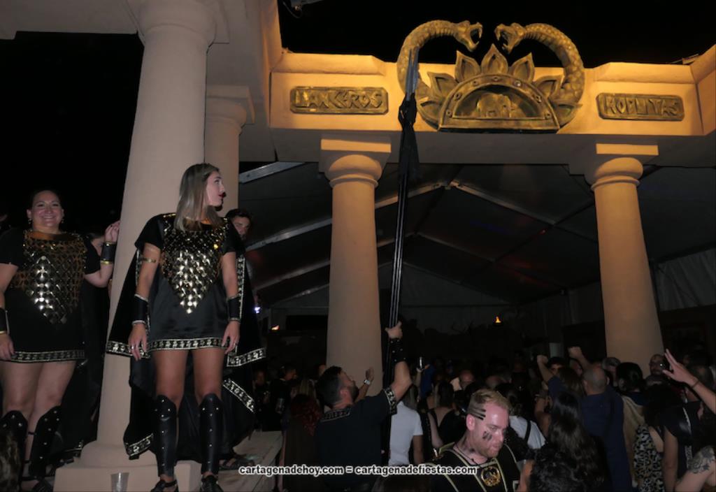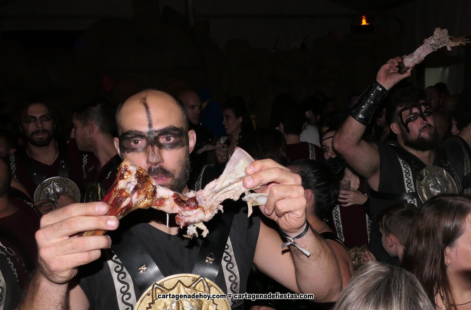 El primer sábado festero tuvo lugar el primer capítulo y la última madrugada festera fue ‘el asalto de vuelta’, con escenografía e invasión de Mercenarios Íberos al templo de Lanceros Hoplitas Libios, donde fueron agasajados con un asado que representa a la codiciada ‘cabra dios’.