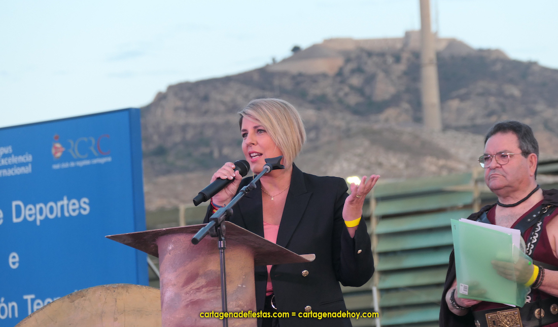 Meca, en su alocución, también elogió la obra de Clara Ledo ("Tiene toda la fuerza que tiene la mujer"), agradeció la participación en 12 casetas de los festeros en la muestra llevada en la 'Noche de los museos' y expresó que con este acto "hoy comienzan las Fiestas del Año XXXIV". Después fue la alcaldesa, Noelia Arroyo, quien se dirigió a los presentes, ensalzando "el compromiso desinteresado de los festeros, que lo hacen por amor a Cartagena".