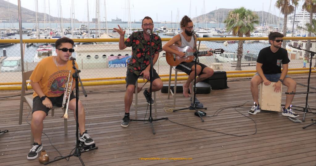 El festival anuncia una segunda edición que aumenta de una a tres las jornadas de celebración en septiembre en la explanada del centro comercial de La Rambla, destacando las actuaciones de La M.O.D.A., OBK, Chimo Bayo y, entre otros, los cartageneros DJ Javi y DJ Pipe, además de la banda Karmacadabra, a la que se observa en la foto durante su actuación esta mañana, en el acto de presentación del festival.