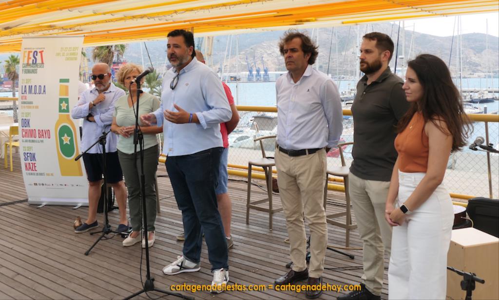 "Pasamos de uno a tres días con perspectivas de seguir creciendo a cuatro en los próximos años". Así ha comenzado José Antonio Meca, presidente de la Federación de Tropas y Legiones, su alocución en el acto de presentación que ha tenido lugar esta mañana del segundo festival de las fiestas cartageneras, que tendrá lugar del 21 al 23 de septiembre, con el patrocinio de Estrella de Levante, Autoridad Portuaria, ICA y otras marcas, a las que se han sumado en esta ocasión Crash Music y Son Buenos. También ha intervenido Paqui Martínez Sotomayor, edil de Festejos, habiendo contado el acto también con la presencia de los concejales Isa Andreu y Juanjo López. También ha asistido el sufeta del Consejo Carthaginés, Víctor Nieto.