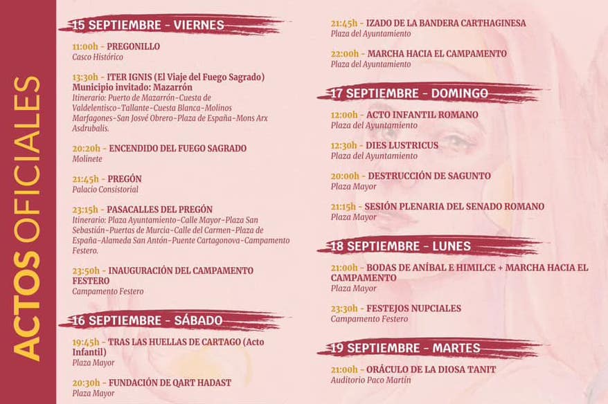 El sábado centra los actos en Plaza Myor, con un primer capítulo infantil denominado ‘Tras las huellas de Cartago’ y un segundo que es la tradicional representación de la fundación de Qart-Hadast por parte de Asdrúbal Janto. El domingo ubica en la plaza del Ayuntamiento su actividad matinal con un acto infantil y el tradicional bautizo de los nuevos festeros. Por la tarde, el drama de la ‘Destrucción de Sagunto’ y el humor ‘bordesico’ de la ‘Sesión del Senado’. Este año tampoco estará el simpático Ajedrez Viviente, que se puso en escena la última vez en 2021 en el Parque de Torres.