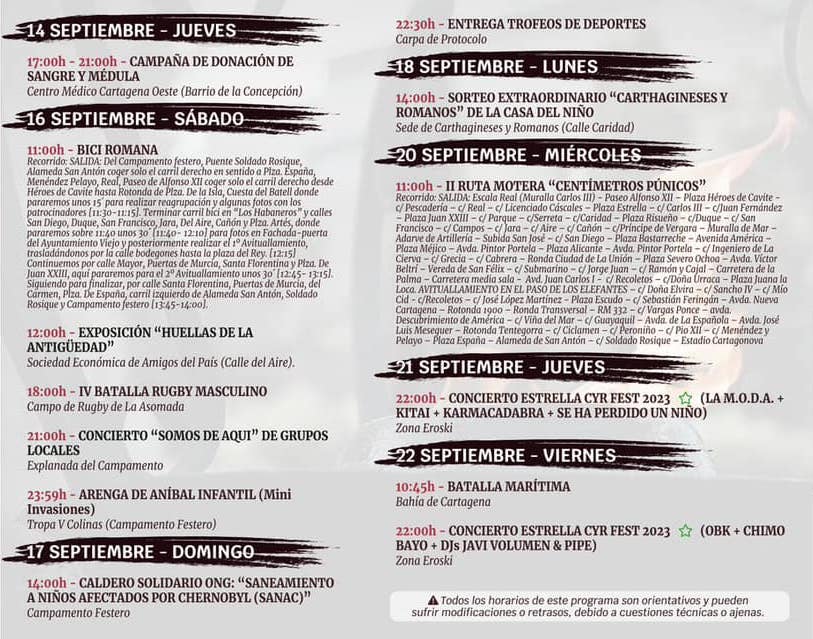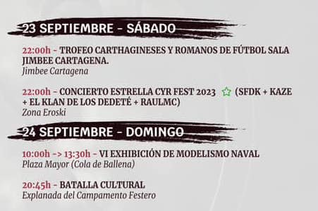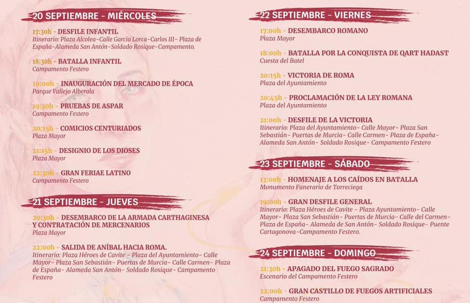 Respecto a las actividades oficiales, se ha encuadrado en este capítulo la ‘Bici-romana’, que seguirá celebrándose el primer sábado festero. Fútbol sala y rugby disputarán trofeos de Carthagineses y Romanos. Lo que no sabemos es si el partido de segunda división del fútbol profesional entre el FC Cartagena y la SD Eibar del domingo 24 mantendrá la tradición de que puedan entrar gratis a Cartagonova los que vayan vestidos de época y que, además de los puntos ligueros, los dos equipos disputen un trofeo festero. En el programa no aparece nada, pero no sería la primera vez que se mantiene este bonito gesto del club blanquinegro hacia las históricas fiestas sin que se haya anunciado.