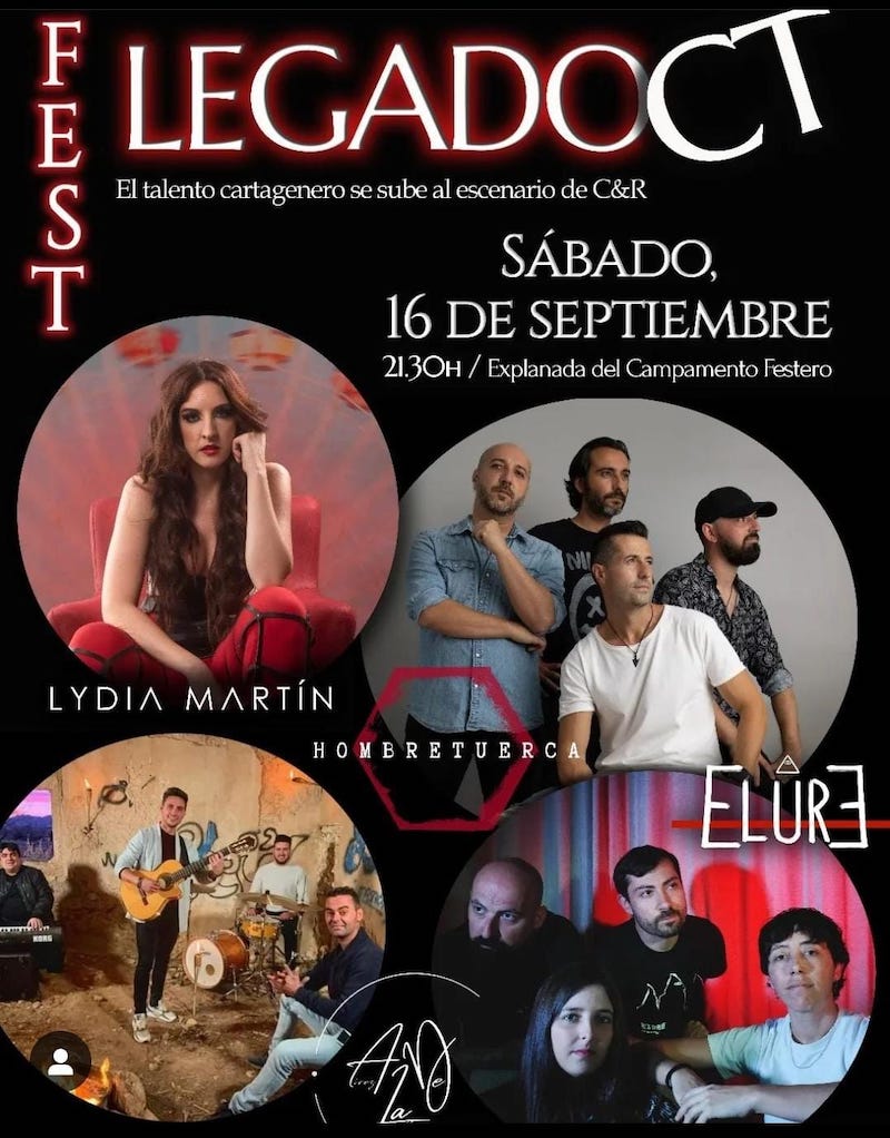 Las fiestas de Cartagineses y Romanos programan un festival con bandas y artistas de Cartagena este sábado próximo bajo el título de 'LegadoCT Fest' y que ofrecerá las actuaciones de 'Elure', 'Aires de la calle', Lydia Martín, 'Hombretuerca' y 'Santi DJ', que ofrecerán una notable variedad de estilos musicales. La entrada es gratuita.