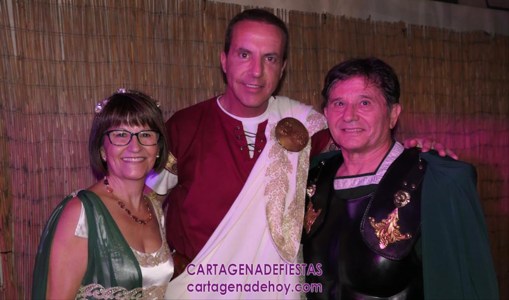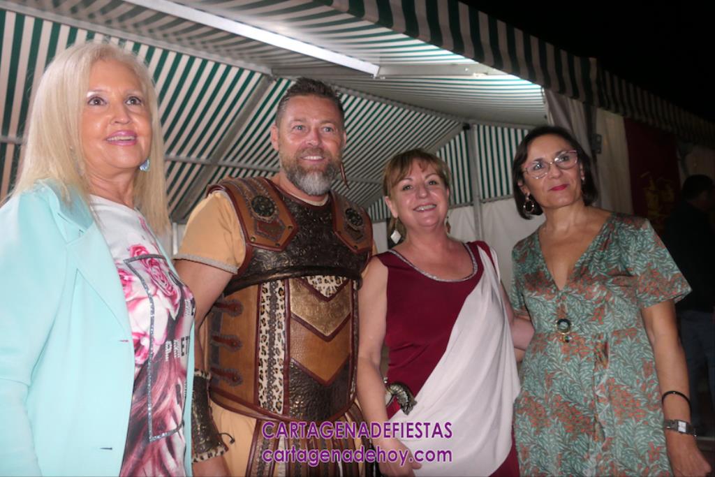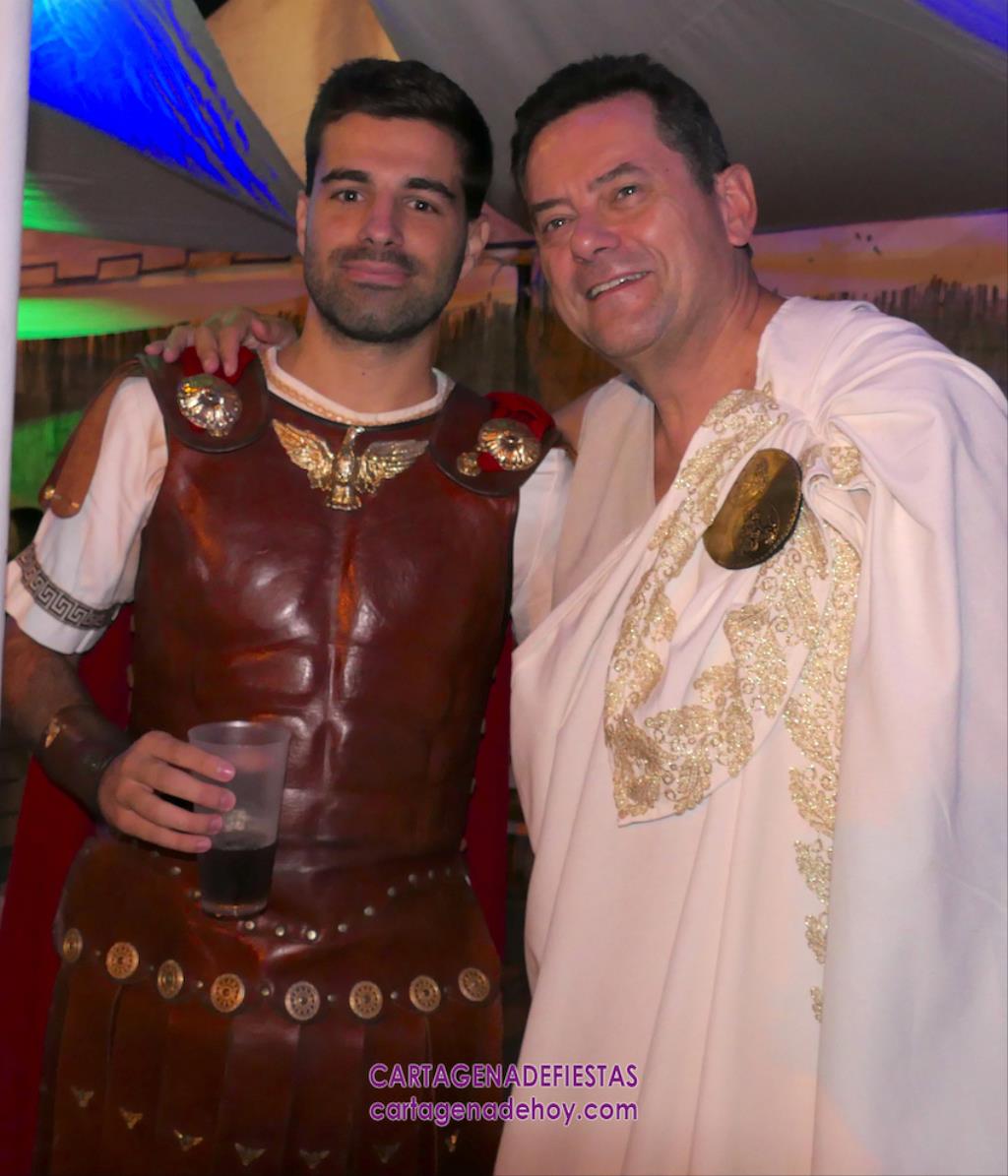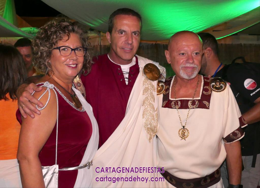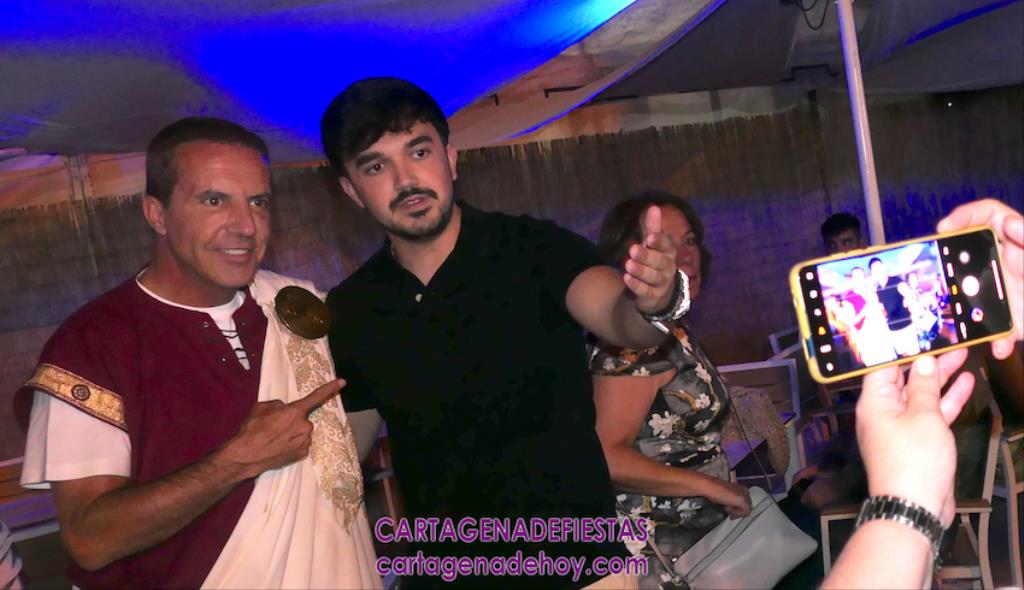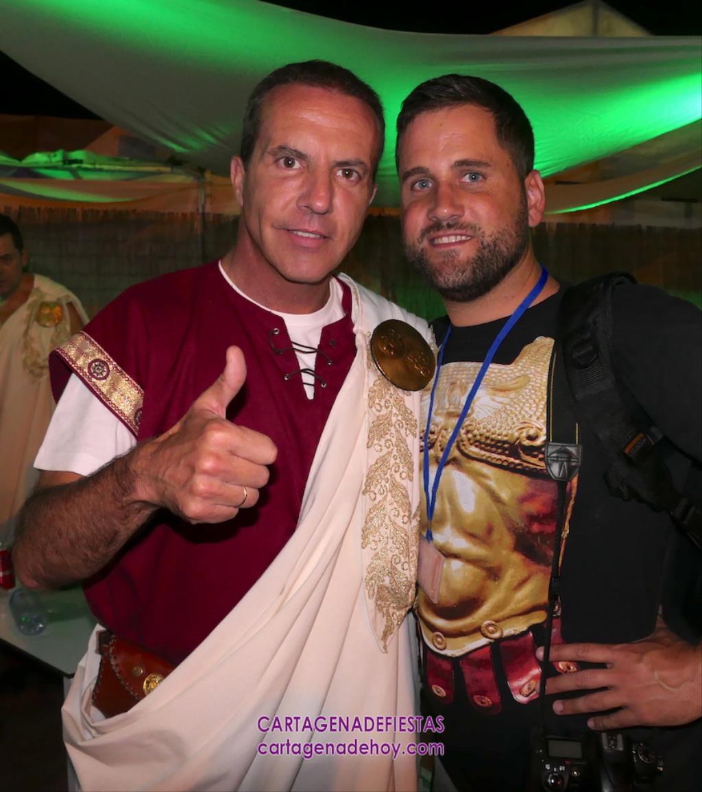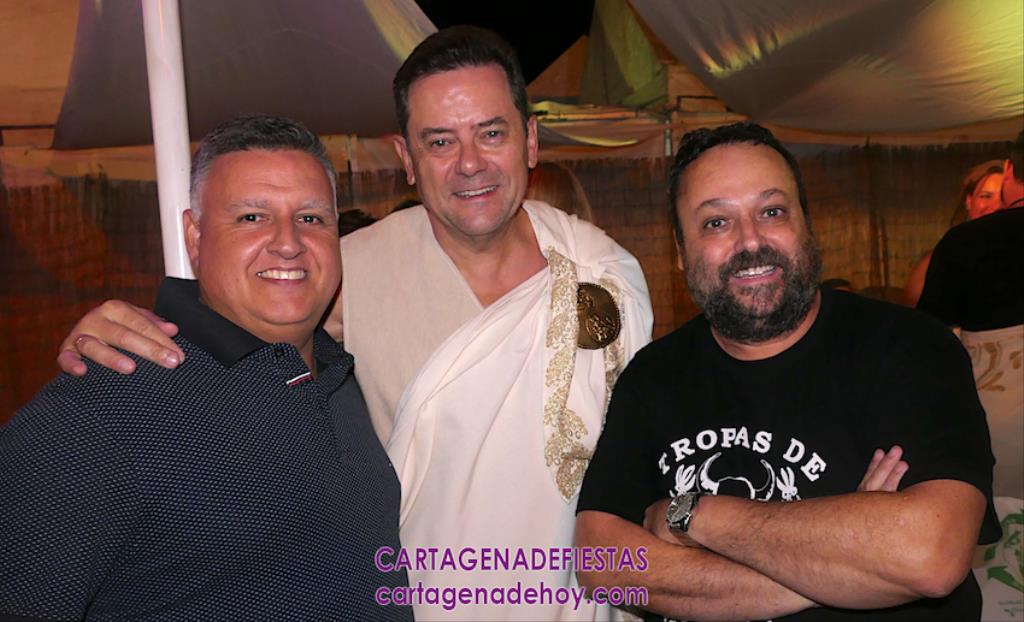 Entre los que estuvieron dentro de los treinta mil metros cuadrados de ciudadela festera figuraban los pregoneros Tomás Roncero y Cristóbal Soria, quienes no ponía pegas a ser fotografiados con decenas de personas. Por cierto, entre las personas con las que posaron estaba Fina, de la Legión de Sagunto, que fue quien les elaboró las túnicas que lucieron en el pregón y en el campamento. En el área de protocolo, además de los anfitriones, también estuvieron ediles de los diferentes partidos políticos con representación municipal, el delegado del gobierno, la alcadesa y, entre otros, representantes del Carnaval de Cartagena y de Modernistas de Cartagena de Levante.