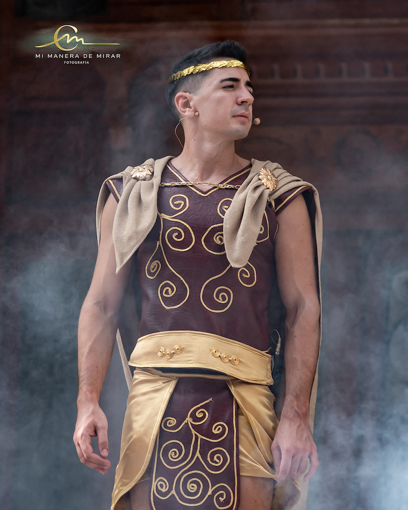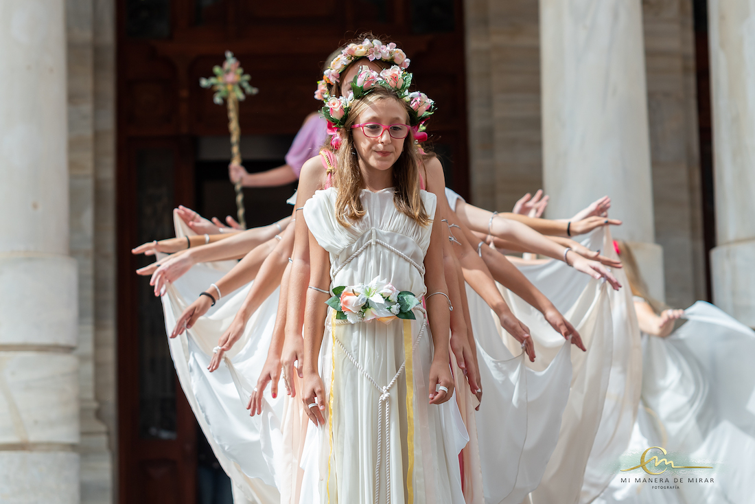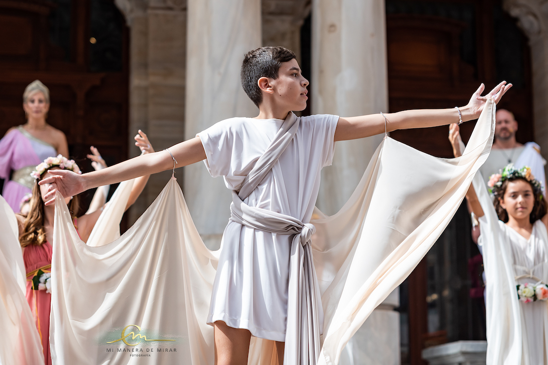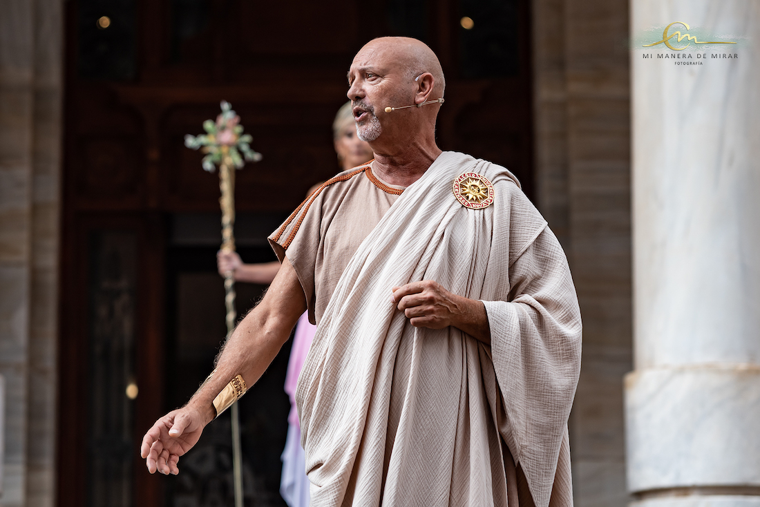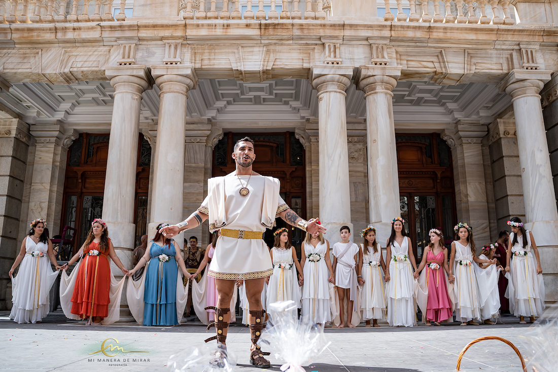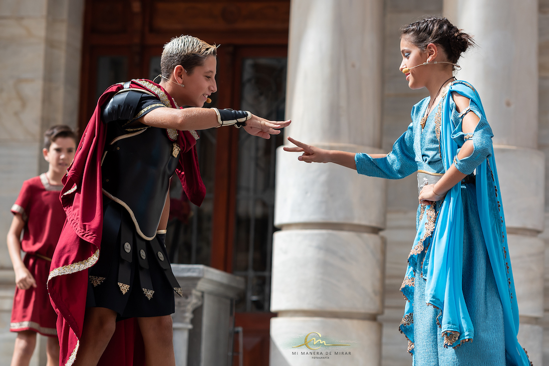 El preludio a los bautizos por el rito romano en la plaza del Ayuntamiento ha sido una representación que ha tenido como protagonistas a Escipión y Emilia Paula infantiles, José Álamo y Sofía Victoria, respectivamente, quienes han demostrado sus buenas cualidades para la escena. Después, unas bellas danzas sobre el escenario que han dado la bienvenida a los dioses Apolo, Juno y Jano.